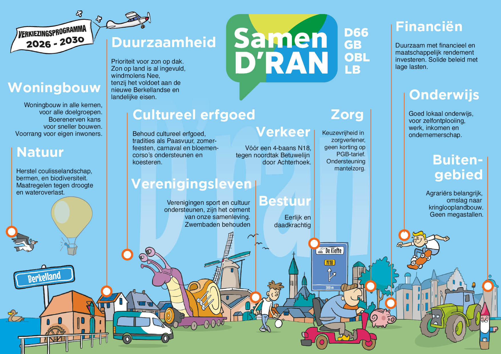 Als nieuwe politiek groepering hebben wij van Samen D’ran hard gewerkt aan ons gezamenlijke verkiezingsprogramma. Het resultaat mag er wat ons betreft zijn, namelijk een ambitieus en realistisch programma waar de denkbeelden van de partijen van deze groepering (D66, Gemeente Belangen, Ondernemend Berkelland en Lokaal Berkelland) mooi samenkomen. Wij vinden dat met dit programma de brede middengroep in onze Berkellandse samenleving goed wordt vertegenwoordigd, zonder iemand te laten vallen. Kortom: het kan wél!